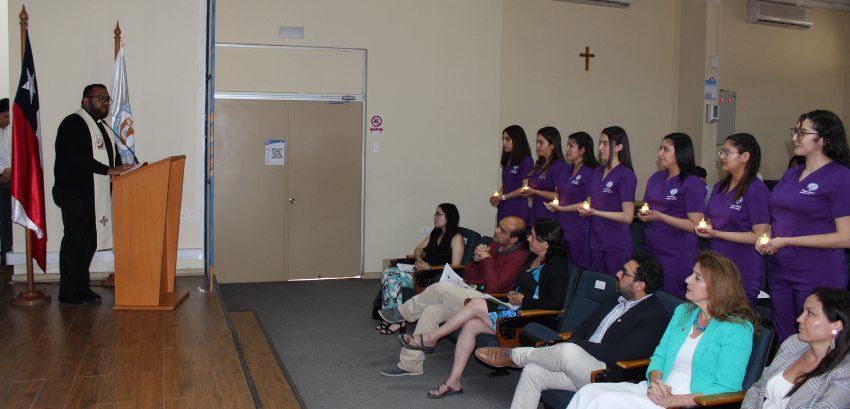 En un momento emotivo, el sacerdote Fernando Castro Cortés, asesor del Departamento de Pastoral y Cultura Cristiana, bendijo a los futuros profesionales, destacando la importancia de su labor y el impacto positivo que pueden tener en la vida de los pacientes.