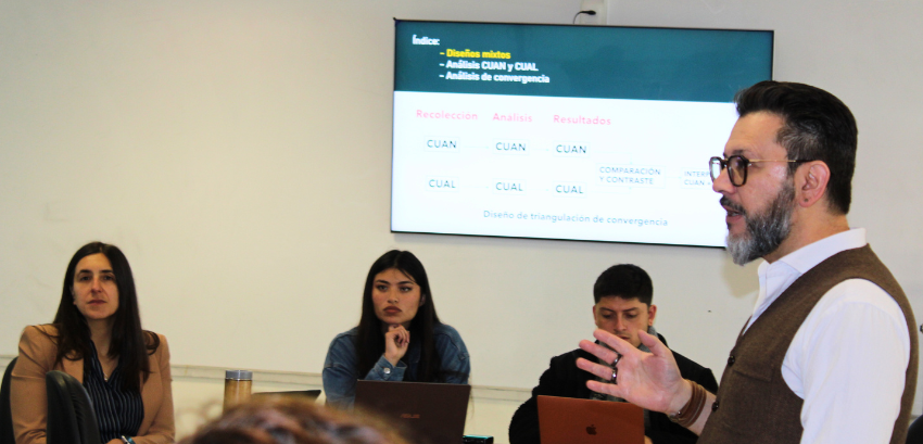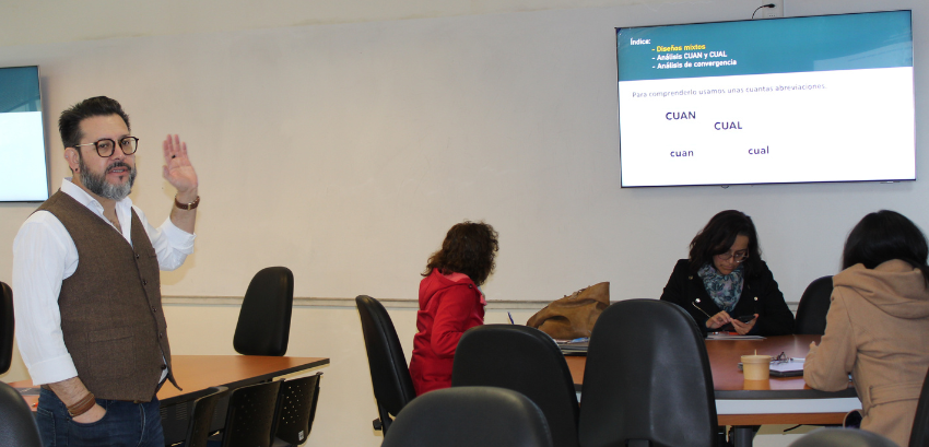 La jornada contó con la destacada participación del Dr. Pablo Cáceres Serrano, académico de la Pontificia Universidad Católica de Valparaíso (PUCV), quien presentó los fundamentos y aplicaciones prácticas de los métodos mixtos en la investigación.
